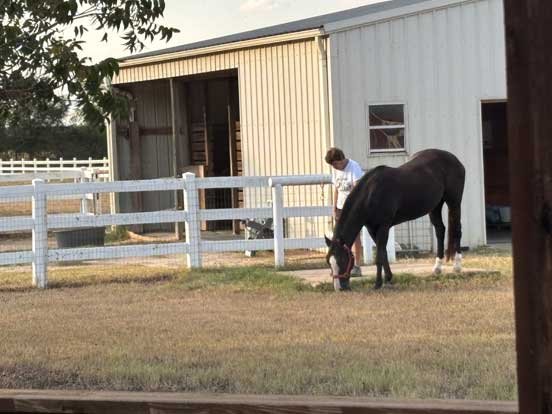 Sophie with her kids • Chris and Jake unloading hay • Chris using birthday blower to clean hay out of her Ridgeline • washing/cooling Sable100 degrees+