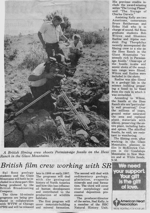 Mom with Ned Kelly and BBC production team on the Hess Ranch for film segment of the BBC production "Making of the Continents" Mom went to England (on Chris & Martin's honeymoon - Nov 3 to Nov 16, 1985) and traveled to Bristol (Nov 7) where she watched some of the editing and was then shown the entire movie). Mom was credited for her part in accessing the Hess ranch for the BBC enabling that segment.