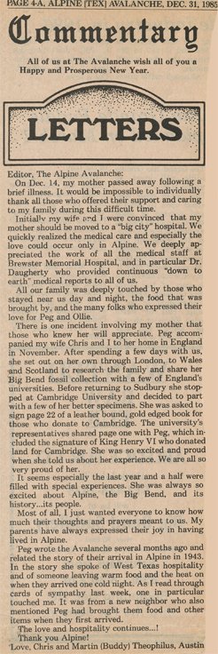In 1986 prior to Thanksgiving, Martin & Chris took Ollie to El Paso to have surgery to repair a hole in his heart that was causing serious health problems. The surgery after Thanksgiving was successful, however Ollie experienced a stroke the next day at which time he lost his ability to speak. In a horrendous situation a "cooling bed" that was being used to stabilize his temperature, malfunctioned. Ollie received 3rd degree burns and was unable to let the nursing staff know. Martin stayed with Ollie all the time, Chris came and stayed as often as she could and Peggy & John and other family members and friends from Alpine visited. Ollie passed away the morning of New Years Day, January 1, 1987. He would have turned 70 in April. more photos