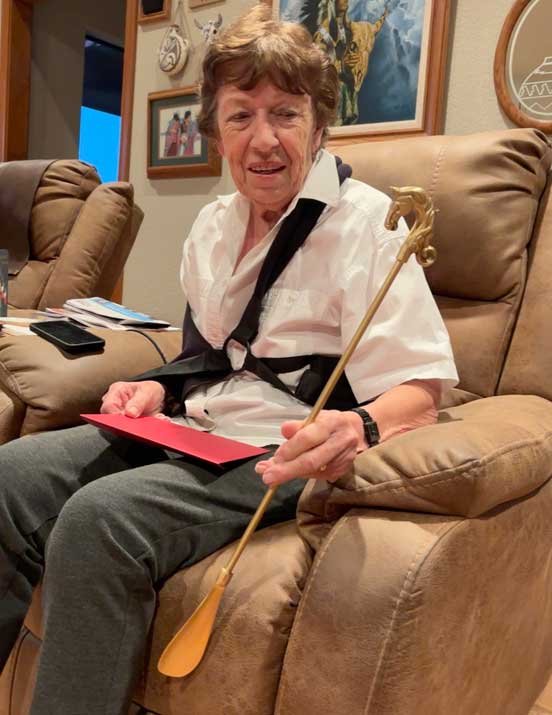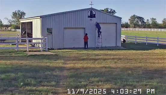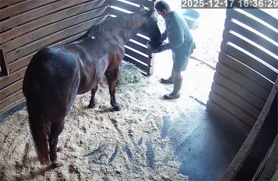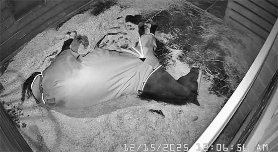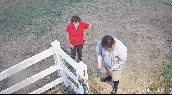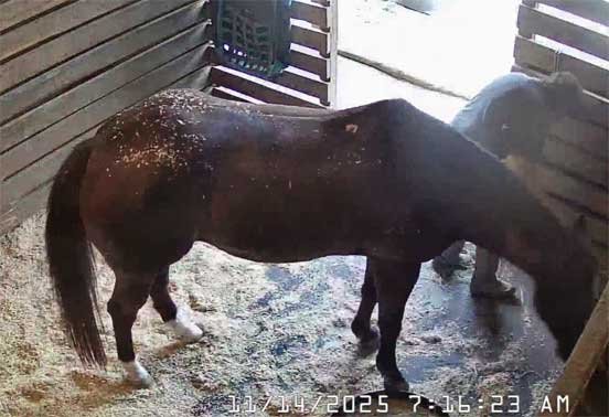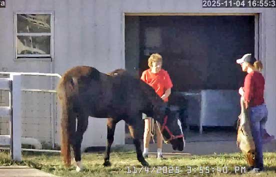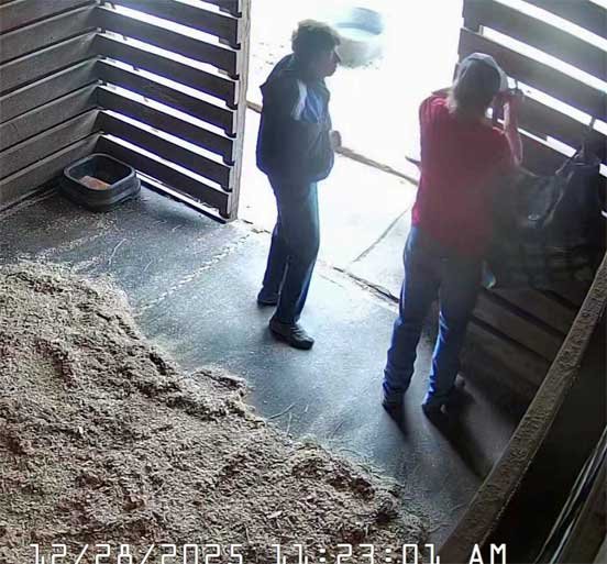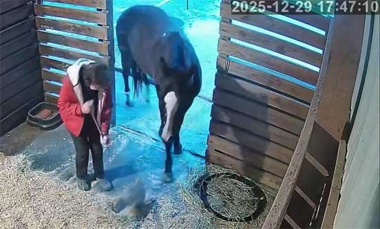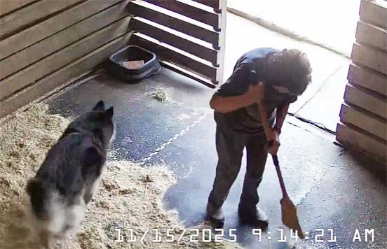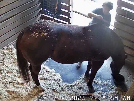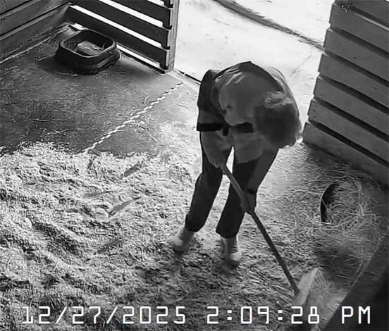 Chris in new jacket (her old one cut off by EMS on 12/17/25) briefly sweeping stable and with Christi - 12/29/25
