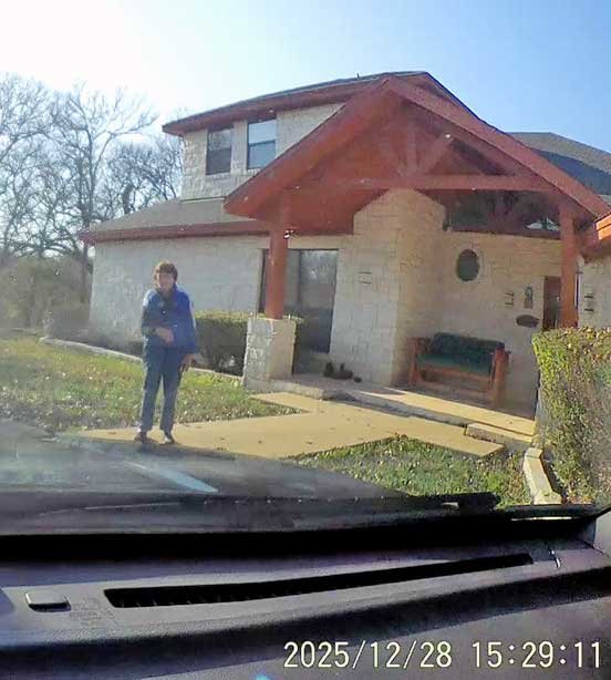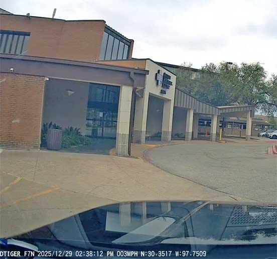 12/28/25 Martin patrol • Bastrop Sheriff's Christmas tree • wrecked patrol car from chase • Sophie looking our dirty back Telluride window.